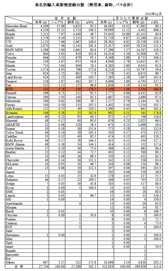 2025年12月05日、『日本自動車輸入組合』が「2025年11月度輸入車新車登録台数速報」が公表しました。