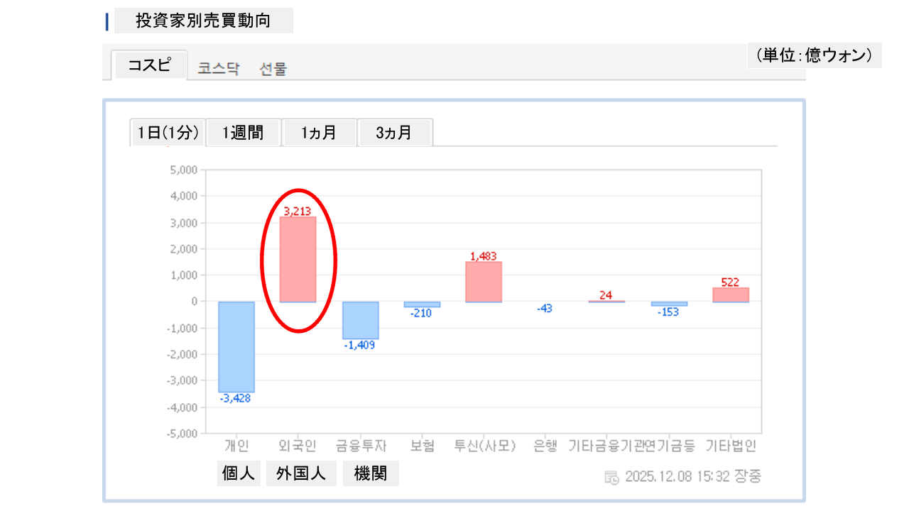 個人投資家は「3,428億ウォン」の売り越し。一方の外国人投資家は「3,213億ウォン」の買い越しです。