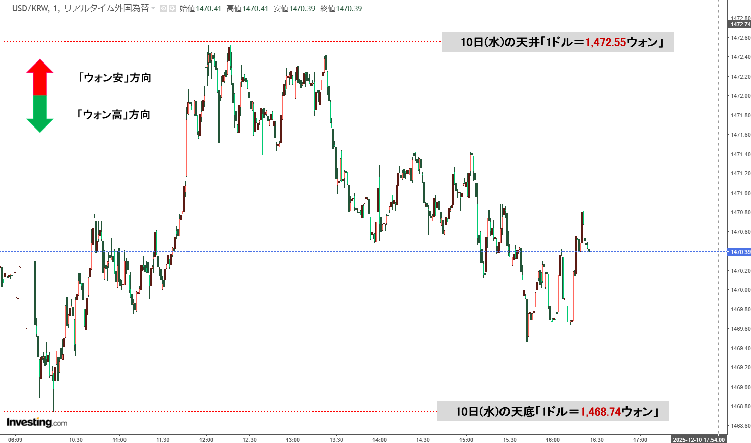 2025年12月10日(水)の韓国時間※が終わりました。16:21現在、ドルウォンのチャートは以下のようになっています(チャートは『Investing.com』より引用)。