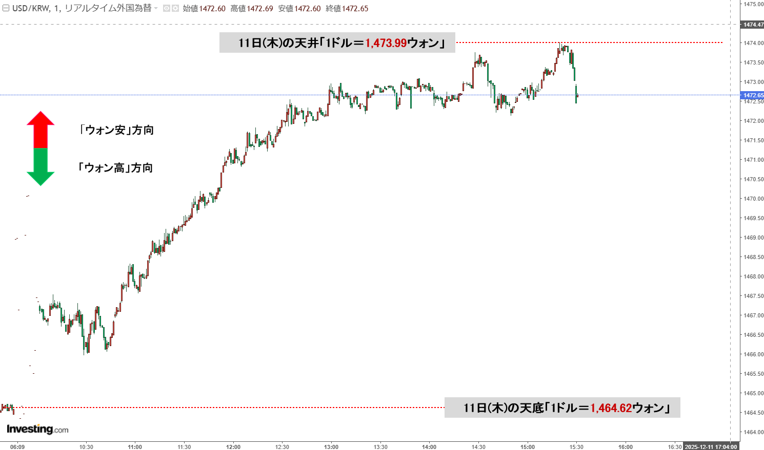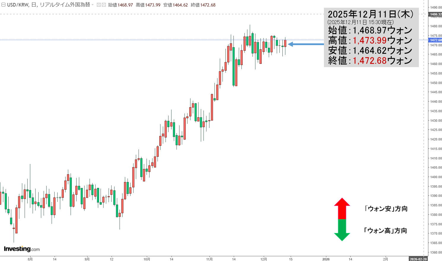 2025年12月11日(木)15:30現在、ドルウォンのチャートは以下のようになっています(チャートは『Investing.com』より引用)。