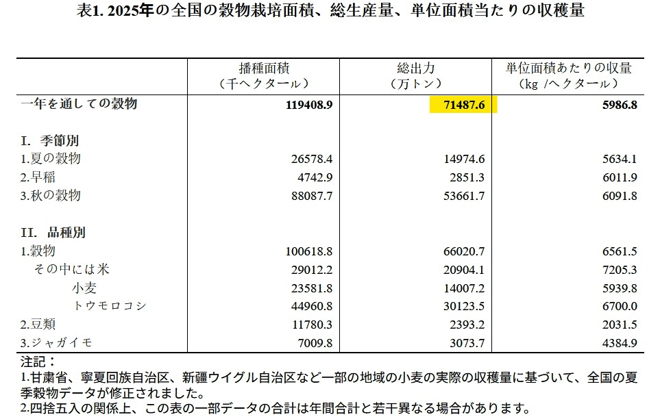 ⇒参照・引用元:『中国 国家統計局』公式サイト「国家統計局による2025年の穀物生産データに関する発表(2025年12月12日)」