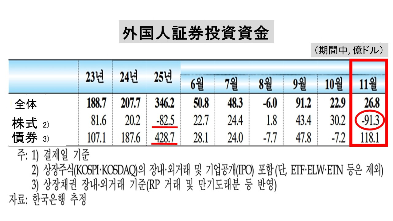 2025年11月は、外国人投資家は韓国の株式を91.3億ドルも売り越しました(上掲は「買収 – 売却」の純買入を示すのでマイナスになれば売り越し)。
