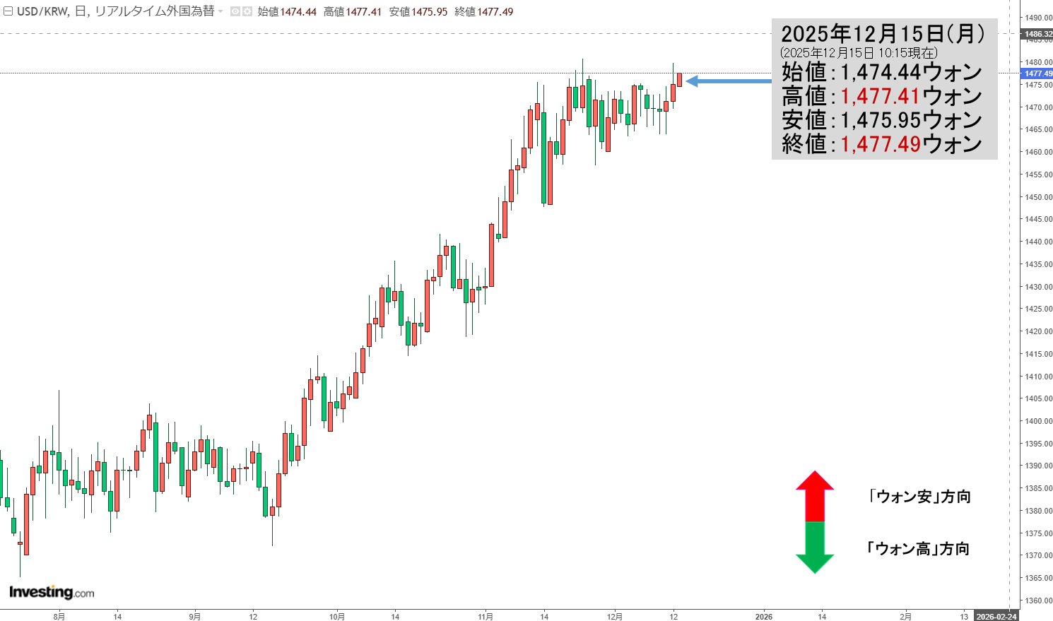 2025年12月15日(月)の市場が開きました。10:15現在、ドルウォンのチャートは以下のようになっています(チャートは『Investing.com』より引用)。