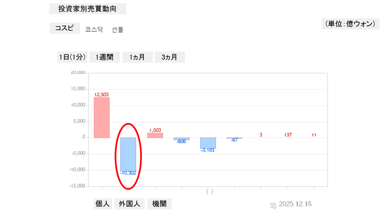 個人投資家は「1兆2,503億ウォン」の買い越し。一方の外国人投資家は「1兆302億ウォン」の売り越しです。