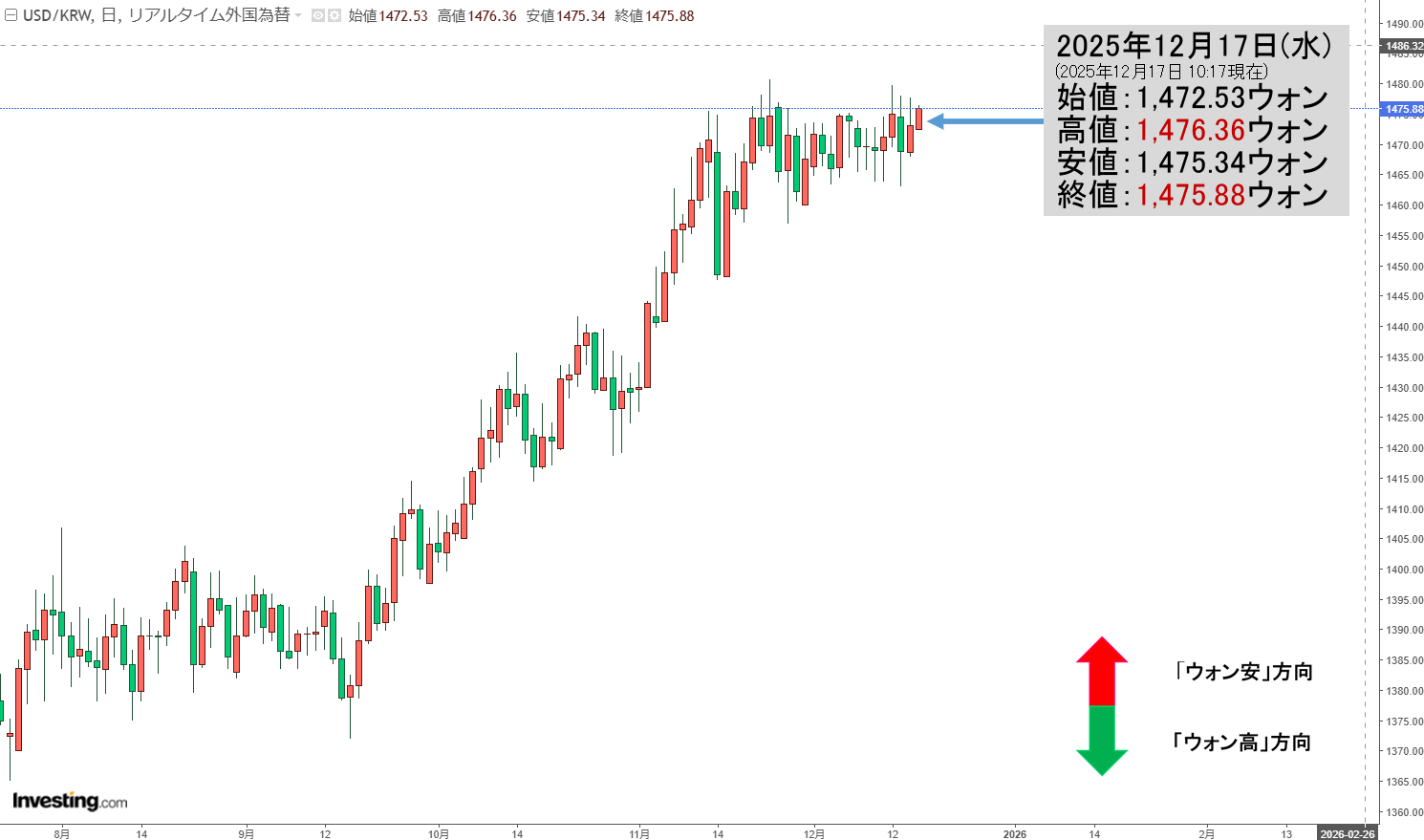 2025年12月17日(水)の市場が開きました。10:17現在、ドルウォンのチャートは以下のようになっています(チャートは『Investing.com』より引用)。