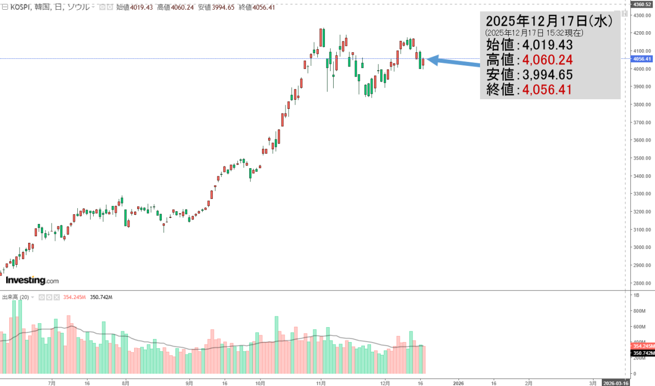 2025年12月17日(水)の韓国株式市場が締まりました。15:32現在、KOSPI(韓国総合株価指数)のチャートは以下のようになっています(チャートは『Investing.com』より引用)。