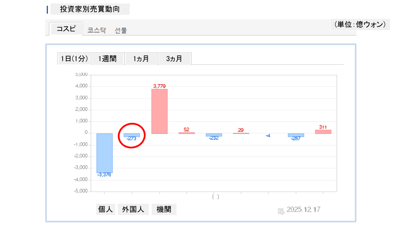 個人投資家は「3,376億ウォン」の売り越し。一方の外国人投資家は「273億ウォン」の売り越しです。