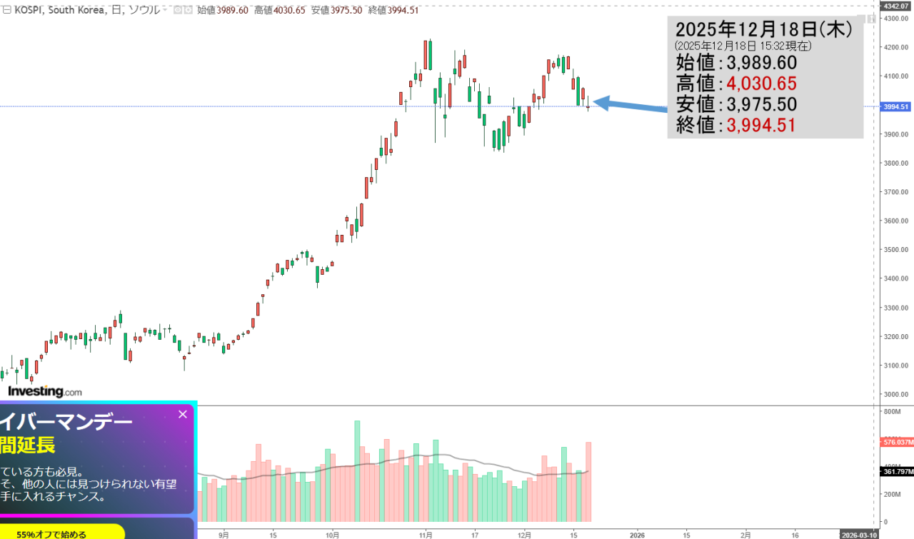 2025年12月18日(木)の韓国株式市場が締まりました。15:32現在、KOSPI(韓国総合株価指数)のチャートは以下のようになっています(チャートは『Investing.com』より引用)。