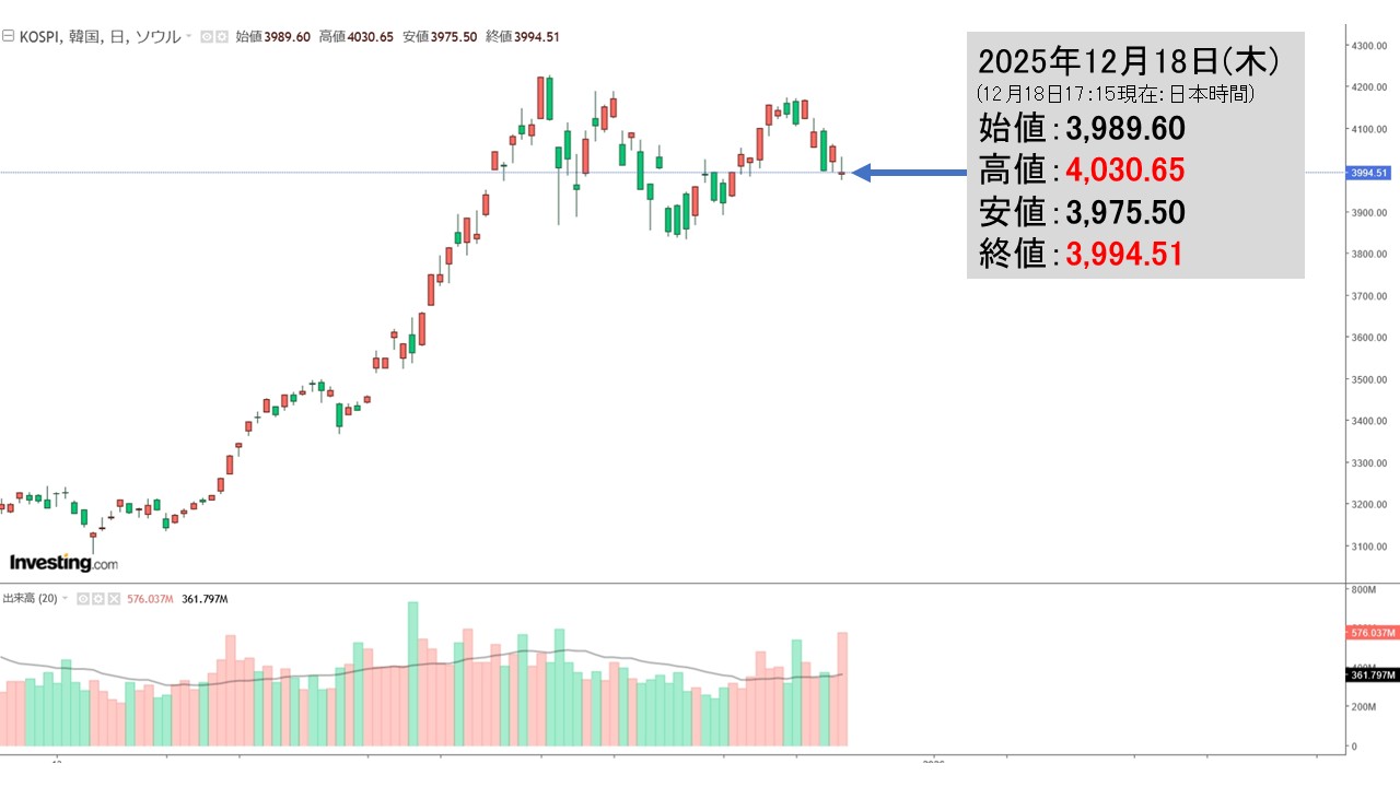 「韓国株式市場」18日(木)決着・KOSPI「3,994」⇒ 再び「4,000」割れ。