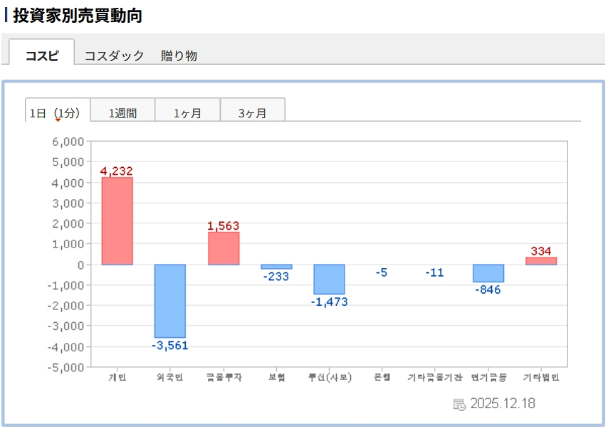 個人投資家は「4,232億ウォン」の買い越し。一方の外国人投資家は「1,561億ウォン」の売り越しです。