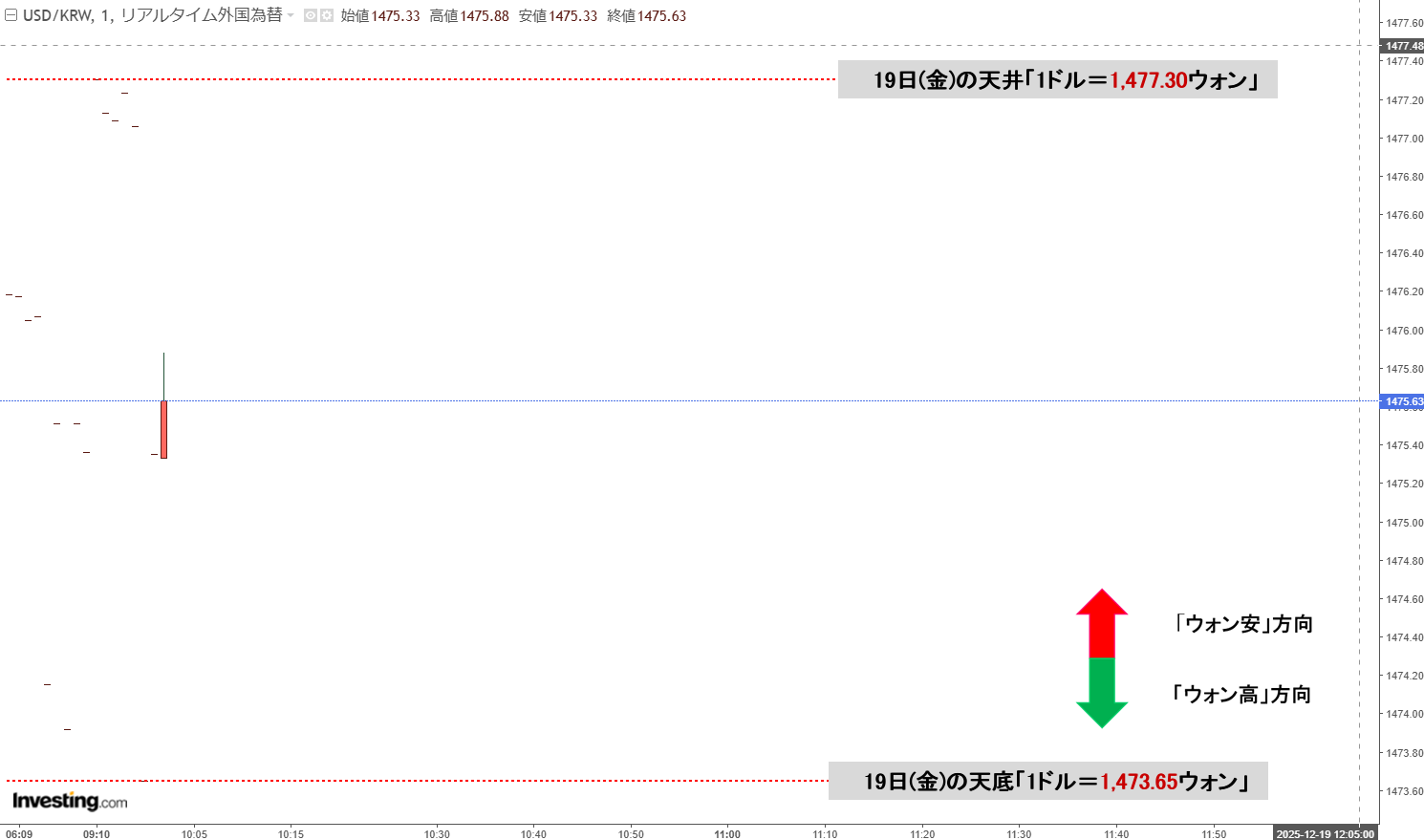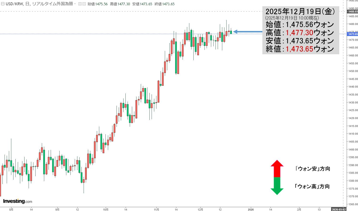 2025年12月19日(金)の市場が開きました。10:00現在、ドルウォンのチャートは以下のようになっています(チャートは『Investing.com』より引用)。
