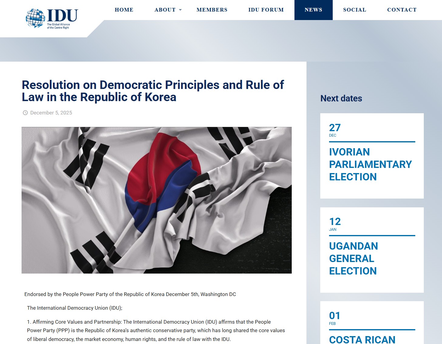 『IDU』は、健全な民主主義は、左派と右派という二つの健全な翼が均衡をもって機能するときにのみ維持され得ると断言する。また、この文脈において、韓国における保守政党の活動を人為的に弱体化させようとするいかなる試みに対しても、『IDU』は引き続き細心の注意を払っていくことを表明する。司法制度改革および一方主義