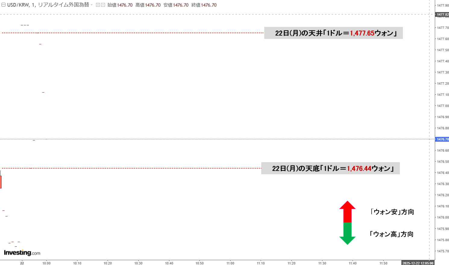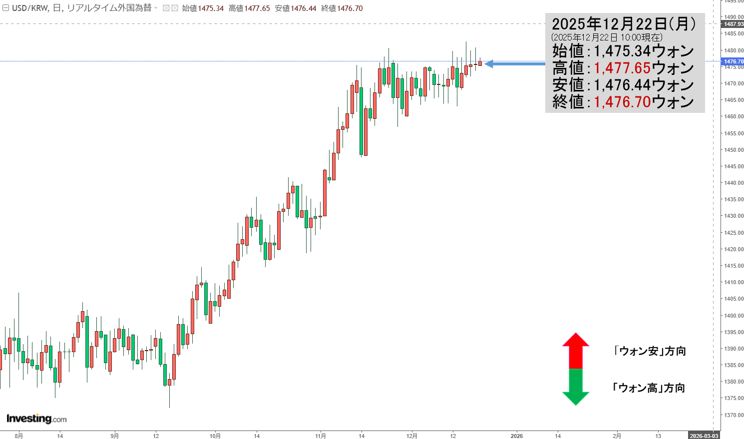 2025年12月22日(月)の市場が開きました。10:00現在、ドルウォンのチャートは以下のようになっています(チャートは『Investing.com』より引用)。