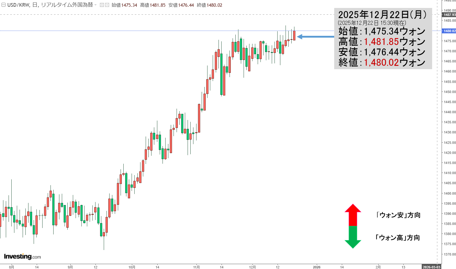 現在のところ「1ドル=1,480ウォン」近辺の攻防となっています。
