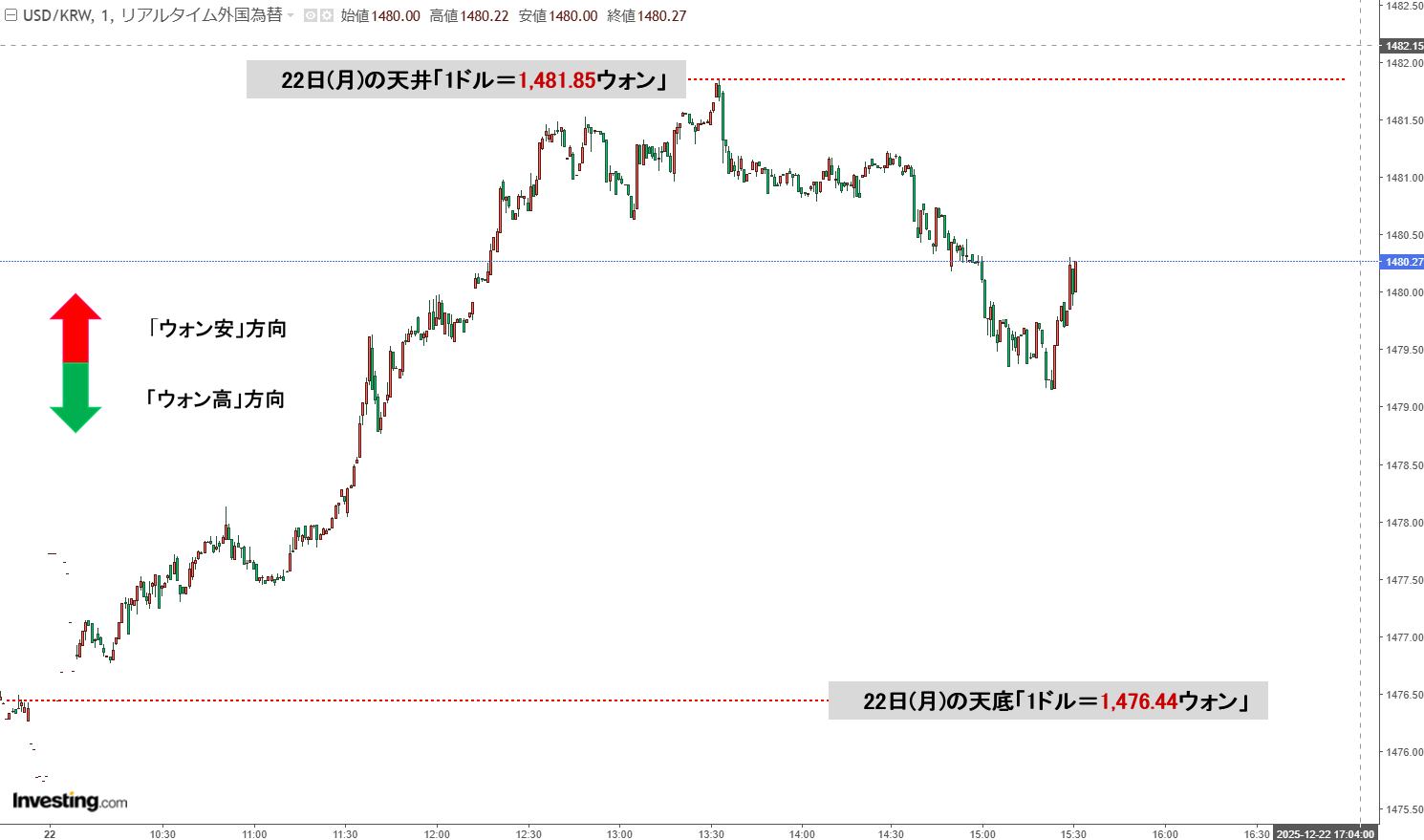 2025年12月22日(月)の韓国時間※が終わりました。15:30現在、ドルウォンのチャートは以下のようになっています(チャートは『Investing.com』より引用)。