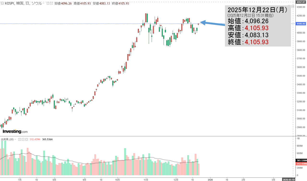 2025年12月22日(月)の韓国株式市場が締まりました。15:31現在、KOSPI(韓国総合株価指数)のチャートは以下のようになっています(チャートは『Investing.com』より引用)。