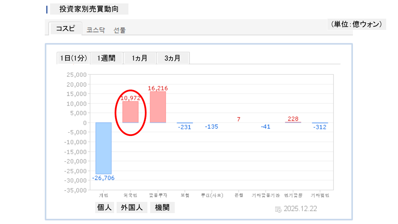 個人投資家は「2兆6,707億ウォン」の売り越し。一方の外国人投資家は「1兆973億ウォン」の買い越しです。