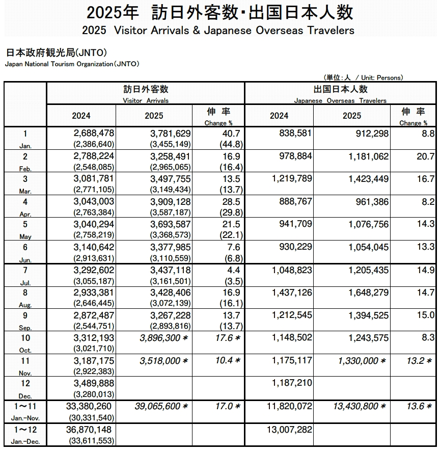 2025年12月17日公開の『日本政府観光局』(略称「JNTO」)が、最新データを公表。「2025年01~11月累計の訪日観光客数」が過去最高を記録したことが分かりました。