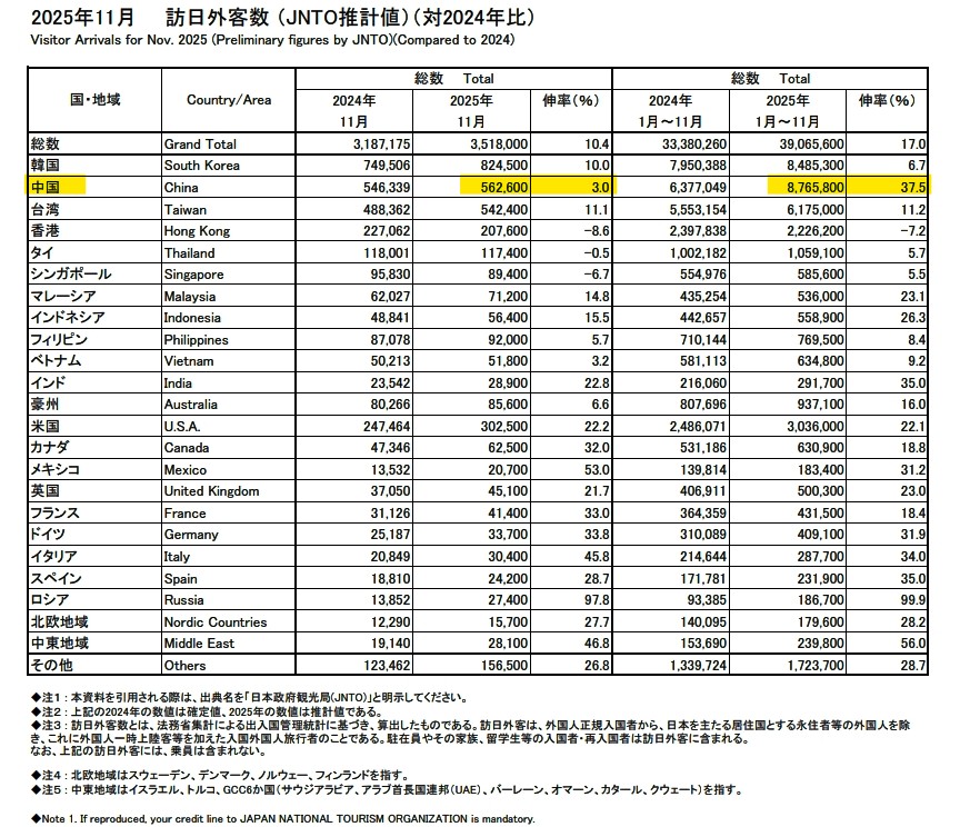 ⇒参照・引用元:『JNTO』公式サイト「訪日外客数(2025年11月推計値)」