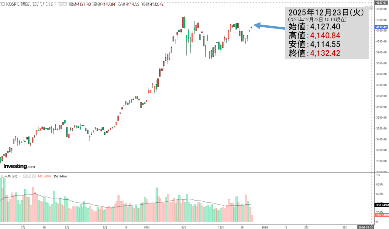 2025年12月23日(火)の韓国株式市場が開きました。10:14現在、KOSPI(韓国総合株価指数)のチャートは以下のようになっています(チャートは『Investing.com』より引用)。