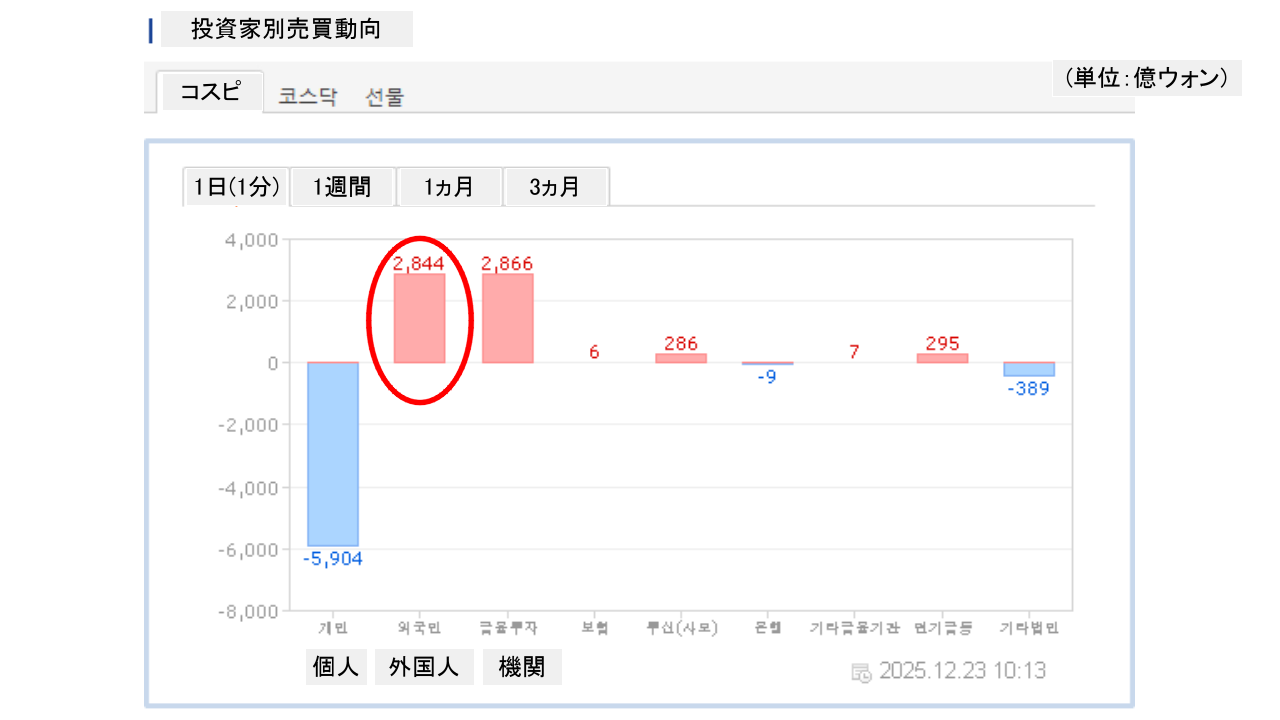 個人投資家は「5,904億ウォン」の売り越し。一方の外国人投資家は「2,844億ウォン」の買い越しです。