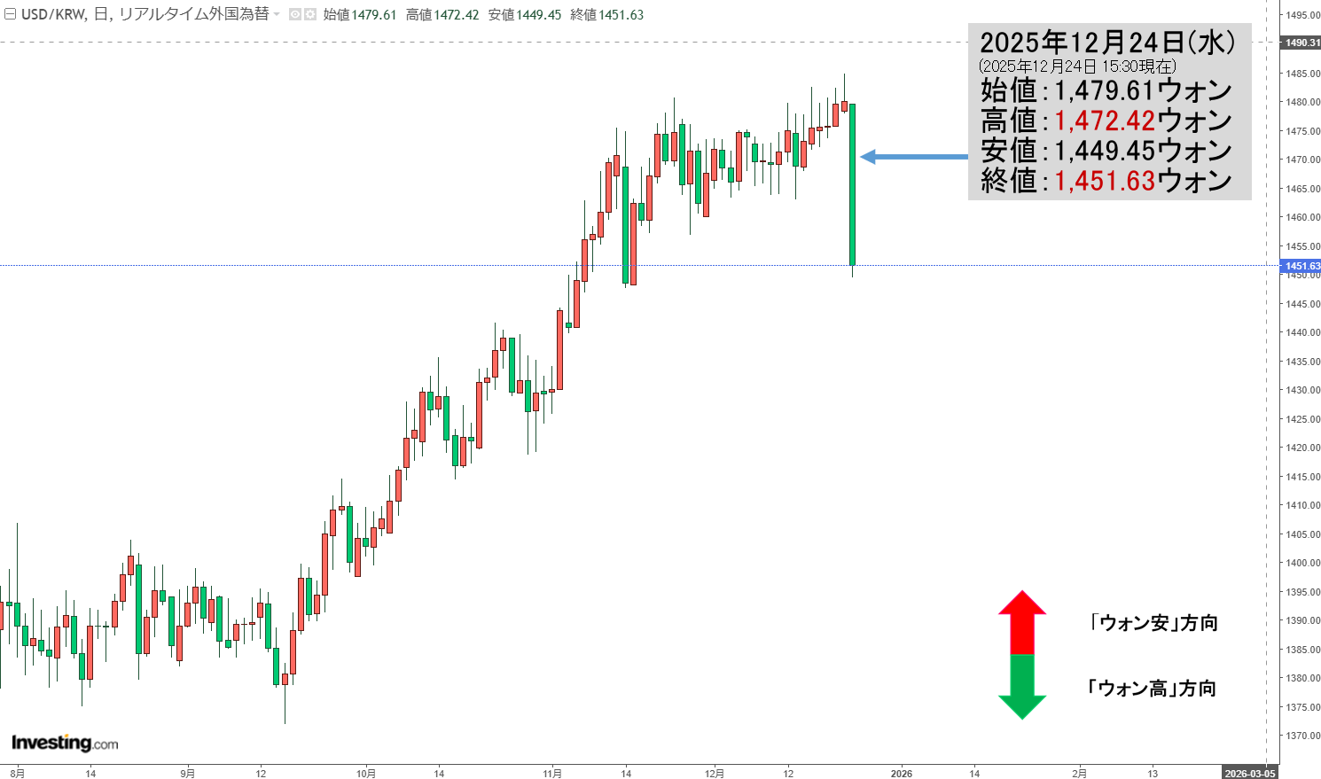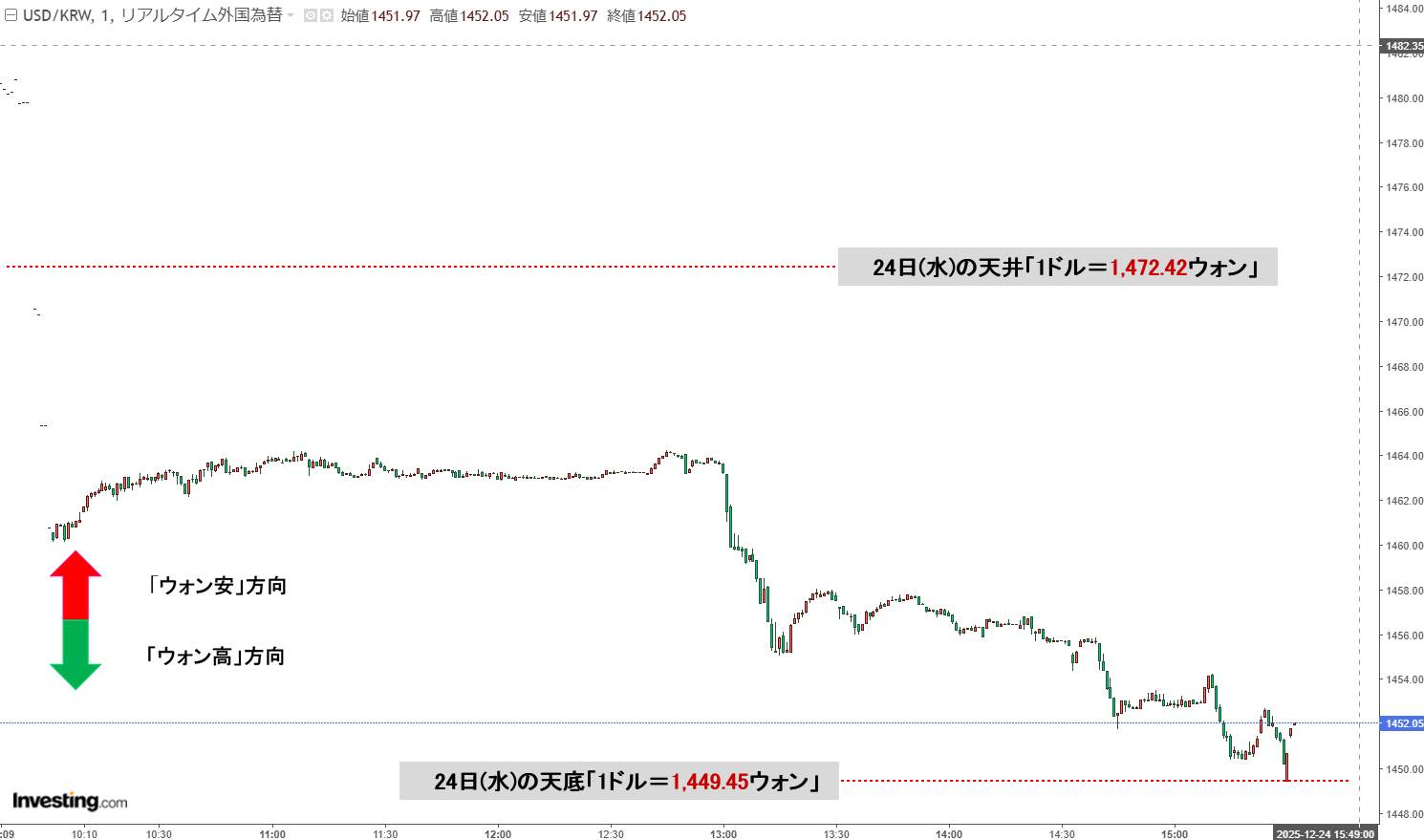 2025年12月24日(水)15:30現在、ドルウォンのチャートは以下のようになっています(チャートは『Investing.com』より引用)。
