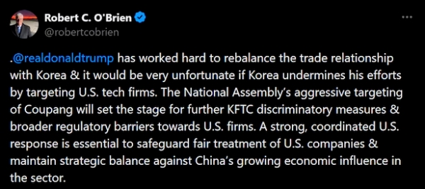 (韓国:引用者注)国会による『クーパン』への攻撃的な標的化は、韓国公正取引委員会(KFTC)によるさらなる差別的措置や、合衆国企業に対するより広範な規制障壁への道を開くことになるだろう。