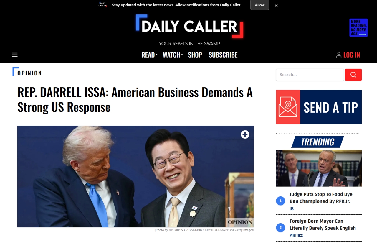 また、保守系オンラインニュース&オピニオンメディア『The Daily Caller』には、「REP. DARRELL ISSA: American Business Demands A Strong US Response(ダレル・イッサ下院議員(共和党)の寄稿:合衆国企業は合衆国の強力な対応を要求している)」という記事が出ました(2025年12月22日付け)。