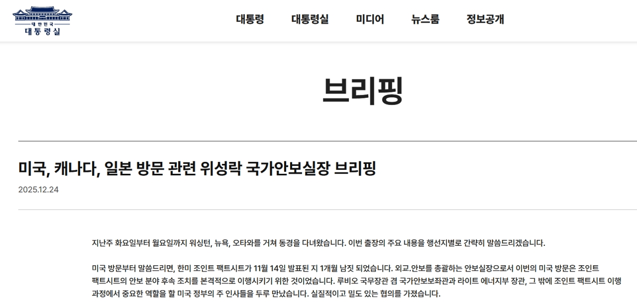 韓国大統領府の国家安保室長である魏聖洛(ウィ・ソンナク)さんが外遊から帰国し、2025年12月24日、記者ブリーフィングを行いました。