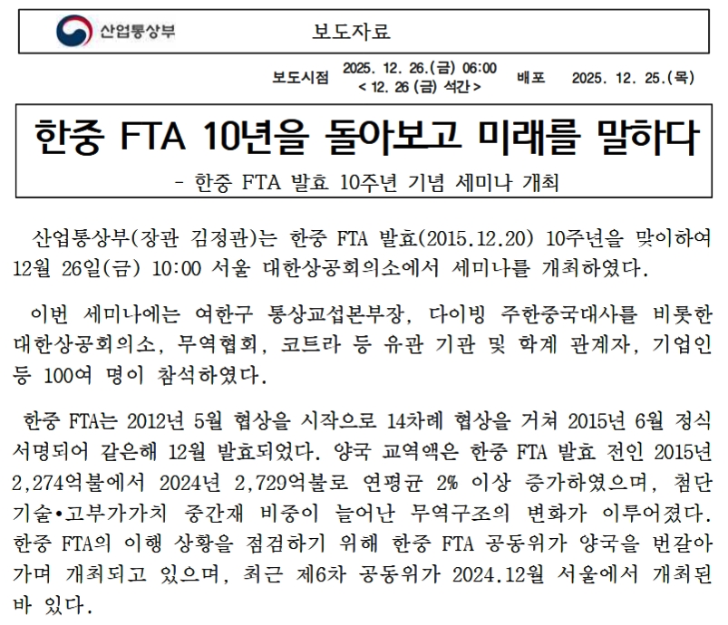 慌ただしい年末ですが、2025年12月26日、韓国の産業通商資源部は「中韓FTA発効10周年記念」のセミナーを開催。