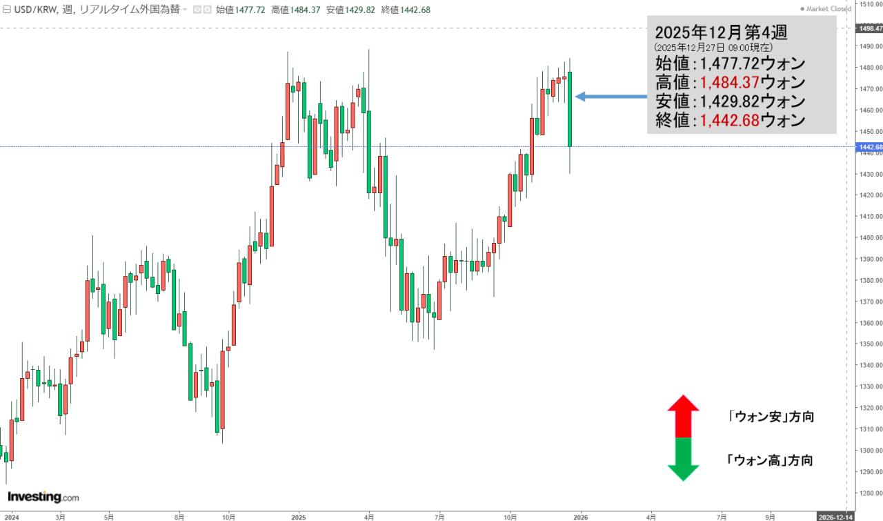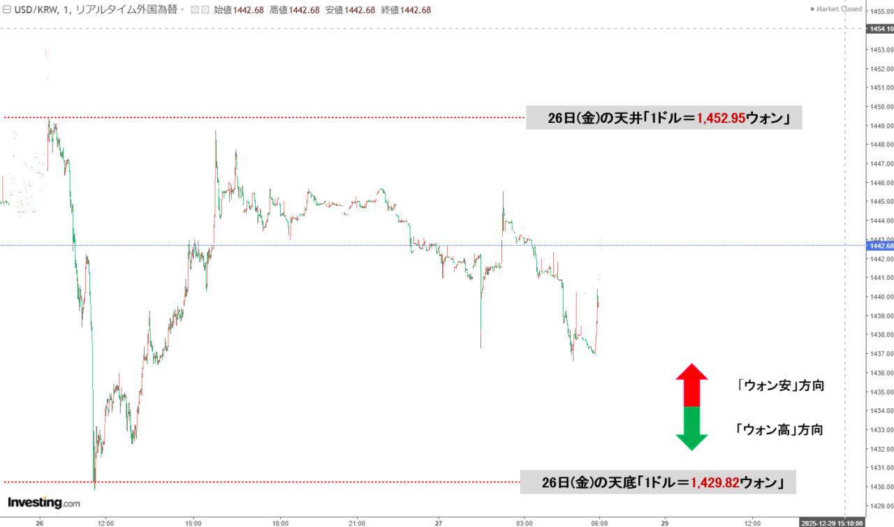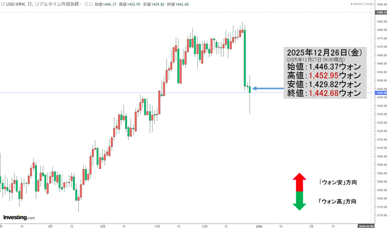 2025年12月26日(金)が(ほぼほぼ)締まりました。2025年12月27日 09:02現在、ドルウォンチャートは以下のようになっています(チャートは『Investing.com』より引用:以下同)。
