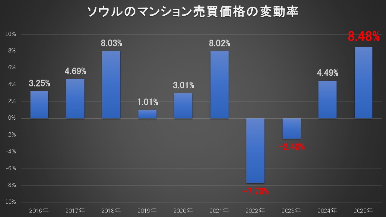 (2025年12月22日時点ですが)、2025年に入ってソウルのマンション売買価格の累計上昇率は8.48%となっています。