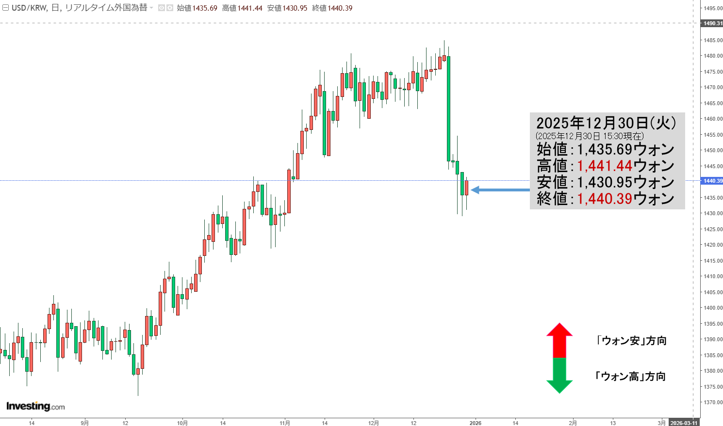 2025年12月30日15:30現在、ドルウォンのチャートは以下のようになっています(チャートは『Investing.com』より引用)。