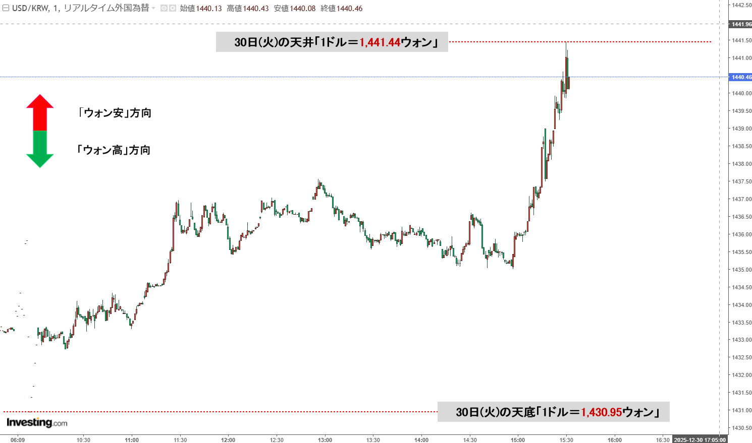 「ドルウォン」30日(火)夕刻・「1,440ウォン」陽転。