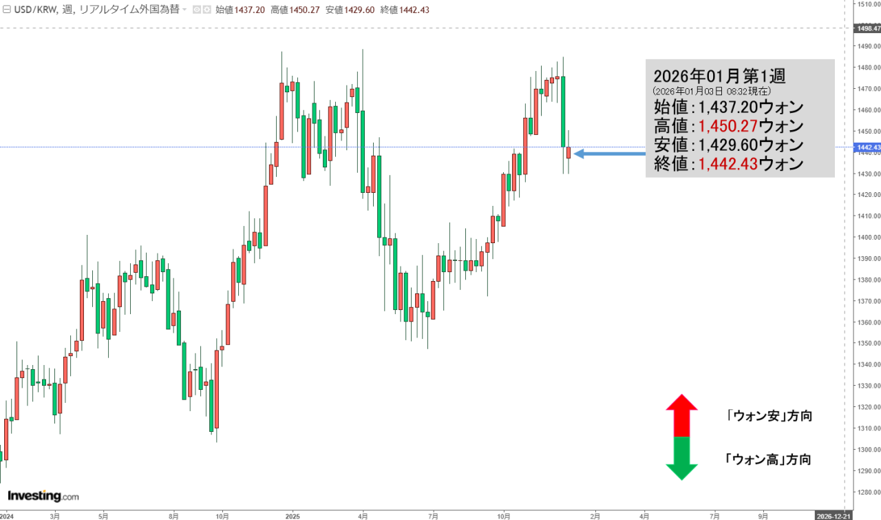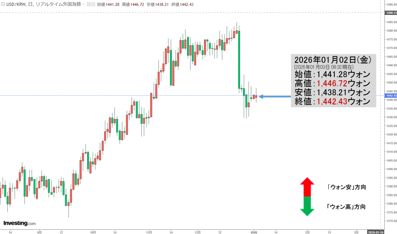 2026年01月02日(金)が(ほぼほぼ)締まりました。2026年01月03日 08:35現在、ドルウォンチャートは以下のようになっています(チャートは『Investing.com』より引用:以下同)。