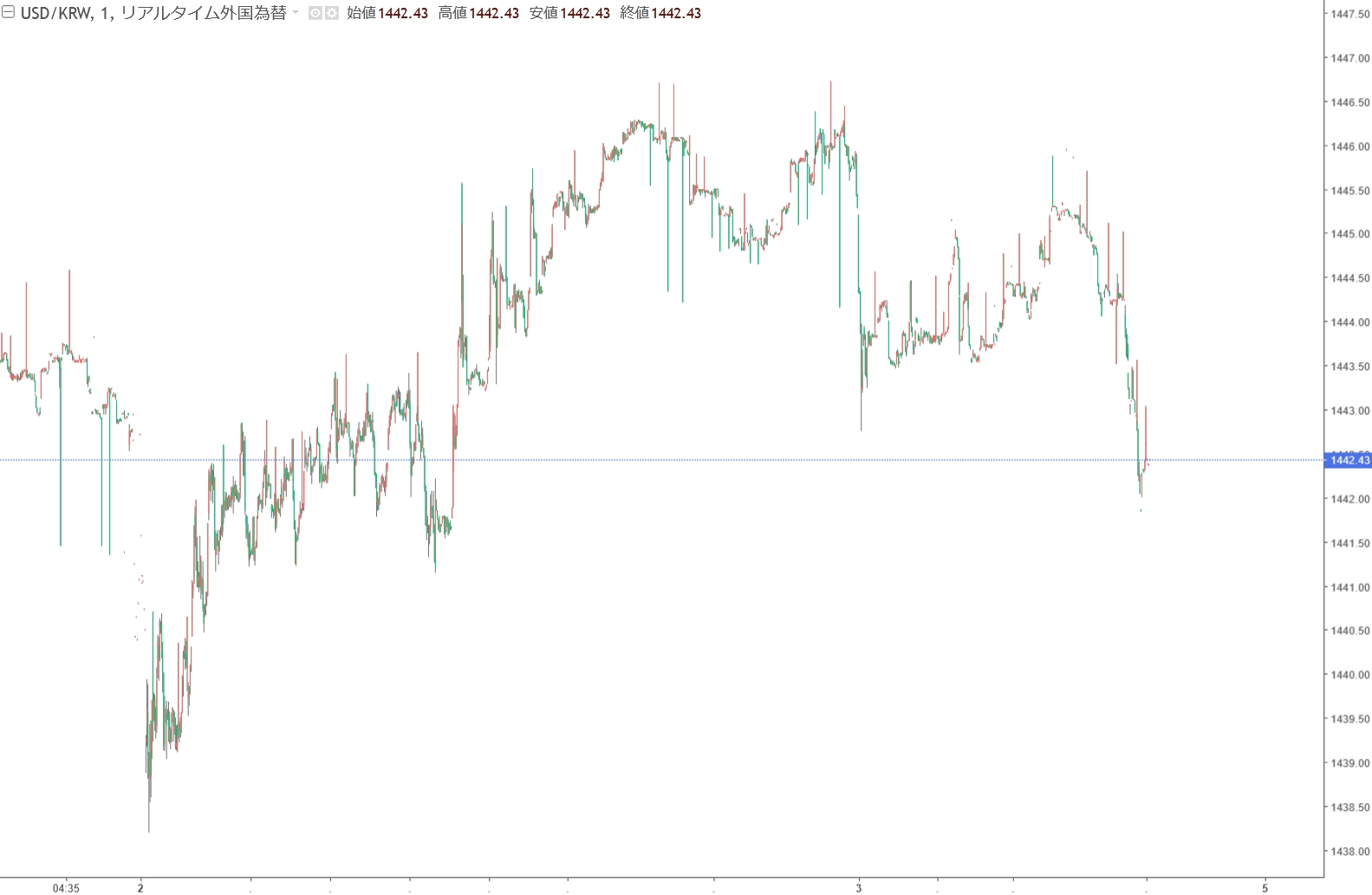なんとか陽線で締まりましたが、ローソク足はコマ足です。終値は「1ドル=1,441.43ウォン」。