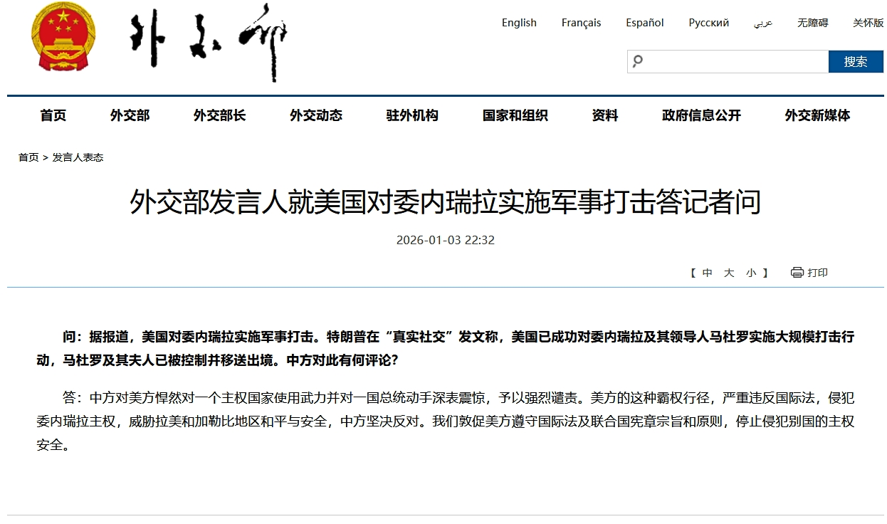 中国側は、合衆国が一つの主権国家に対して武力を乱用し、かつ一国の大統領に対して手を下したことに対し、深い衝撃を受けており、これを強く非難する。合衆国のこのような覇権的行為は、国際法に重大に違反し、ベネズエラの主権を侵害し、ラテンアメリカおよびカリブ地域の平和と安全を脅かすものであり、中国側はこれに断固として反対する。
