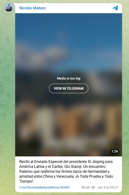 合衆国の軍事行動の前日(01月02日)には、中国外交部のラテンアメリカ・カリブ担当特別代表である邱小琪さんが、ベネズエラのカラカスを訪問し、ミラフローレス宮殿でマドゥロ大統領と会談を行っているからです。