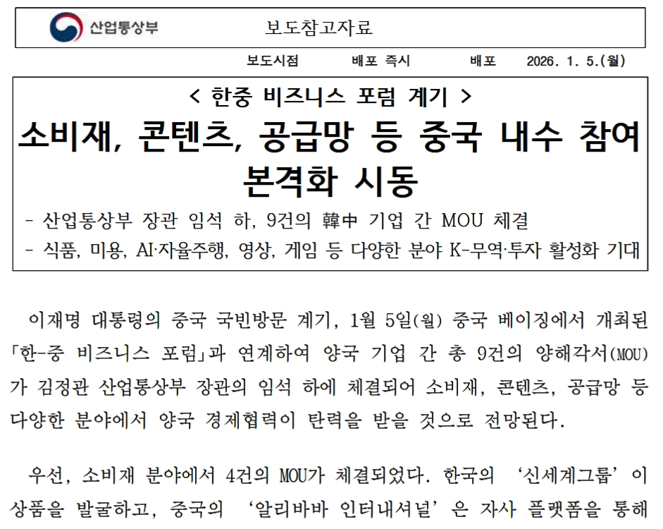食品、美容、AI・自動運転、映像、ゲームなど多様な分野でK-貿易・投資の活性化に期待李在明(イ・ジェミョン)大統領の中国国賓訪問を契機として、01月05日(月)に中国・北京で開催された「韓中ビジネスフォーラム」と連携し、両国企業間で計9件の覚書(MOU)が、金正官(キム·ジョングァン)産業通商部長官の臨席の下で締結され、消費財、コンテンツ、サプライチェーンなど多様な分野において両国経済協力が弾みをつけるものと展望されている。