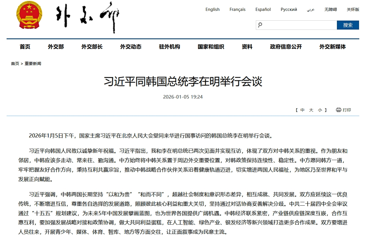 2026-01-05 19:242026年01月05日午後、国家主席の習近平は、北京の人民大会堂において、国賓として訪中している韓国大統領の李在明と会談を行った。