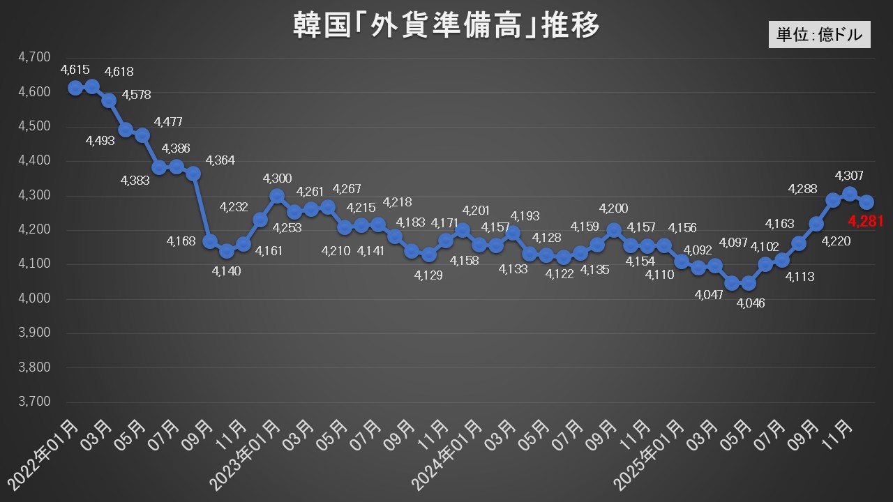 韓国の外貨準備高は2025年12月時点で、対前月比26億ドル減少の「4,281億ドル」となりました。