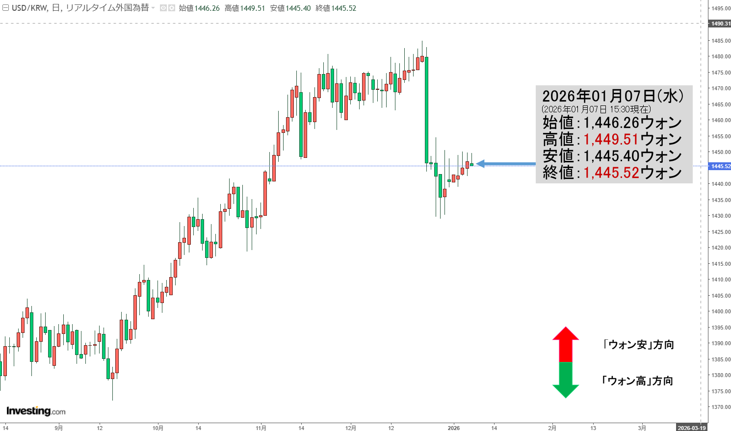 「ドルウォン」01月08日(木)初動・「1,447ウォン」ウォン安圧は弱くない。