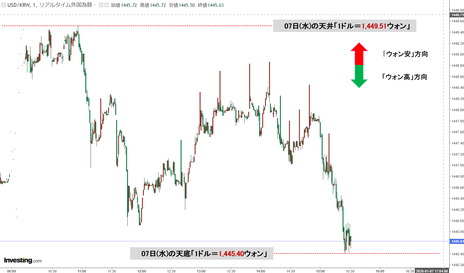 現在の天井は「1ドル=1,449.51ウォン」、天底は「1ドル=1,445.40ウォン」です。