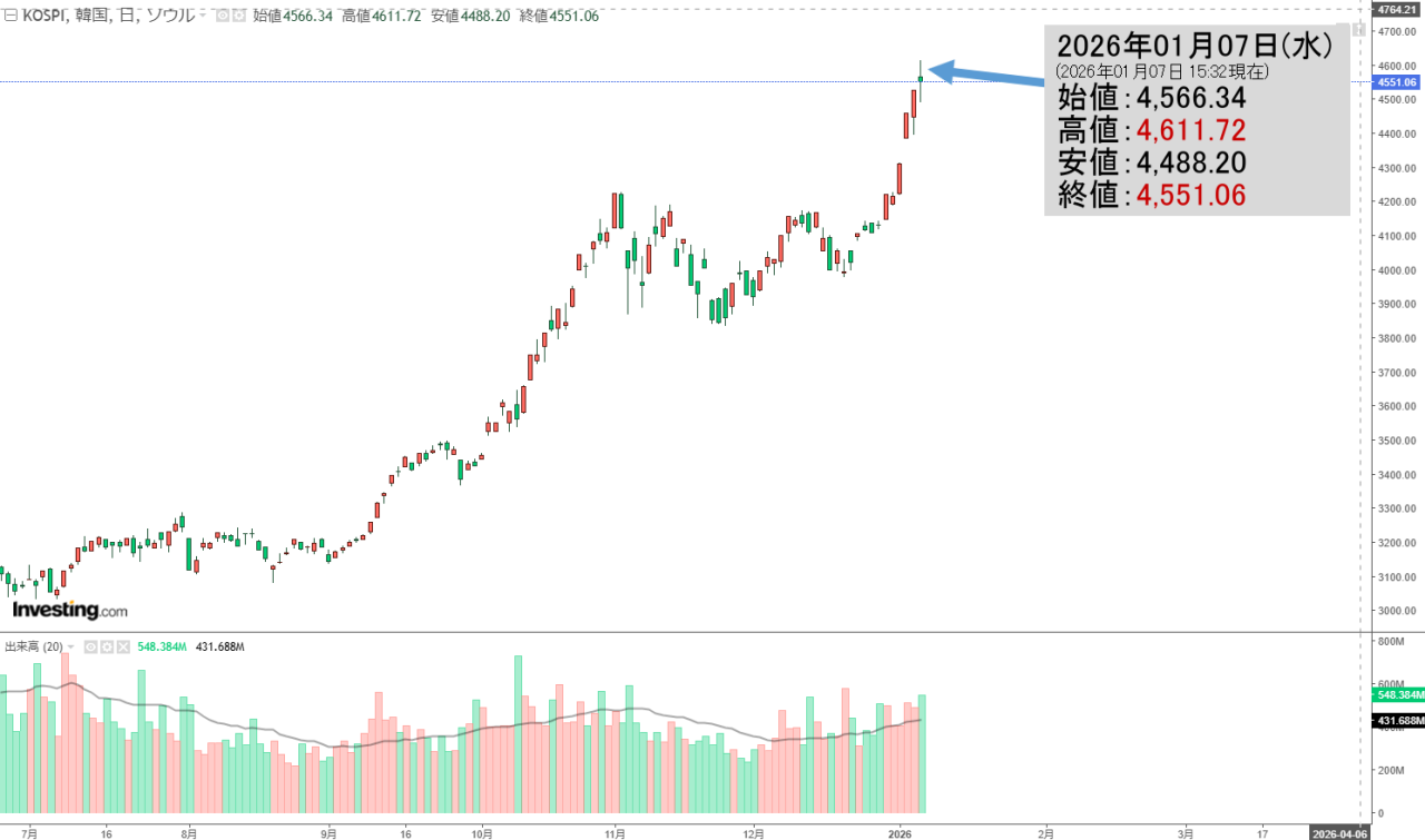 2026年01月07日(水)の韓国株式市場が締まりました。15:32現在、KOSPI(韓国総合株価指数)のチャートは以下のようになっています(チャートは『Investing.com』より引用)。