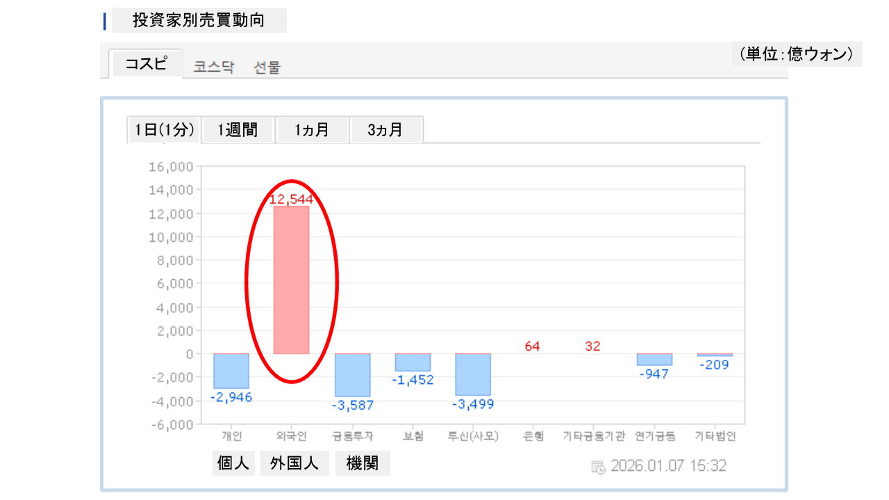個人投資家は「2,946億ウォン」の売り越し。一方の外国人投資家は「1兆2,544億ウォン」の買い越しです。