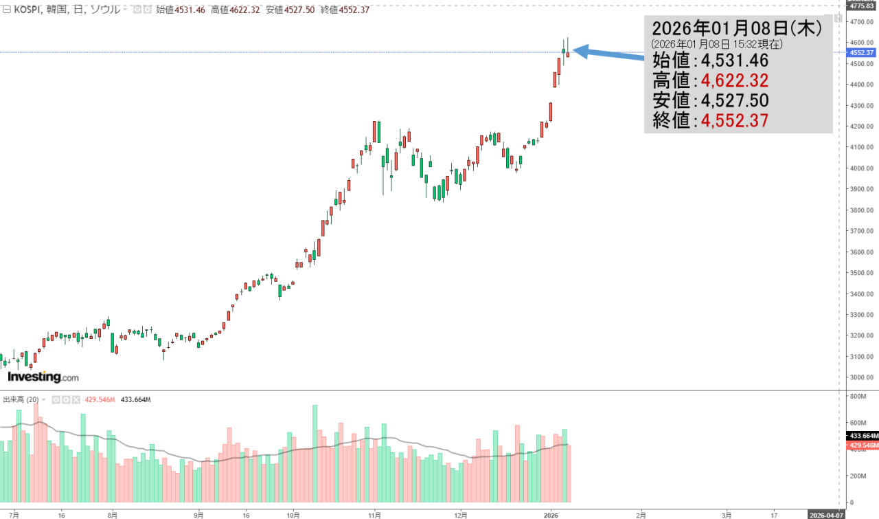 2026年01月08日(木)の韓国株式市場が締まりました。15:32現在、KOSPI(韓国総合株価指数)のチャートは以下のようになっています(チャートは『Investing.com』より引用)。