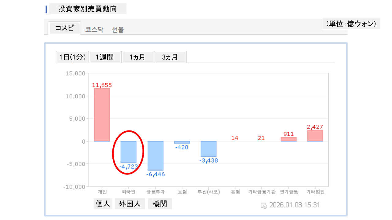個人投資家は「1兆1,655億ウォン」の買い越し。一方の外国人投資家は「4,723億ウォン」の売り越しです。