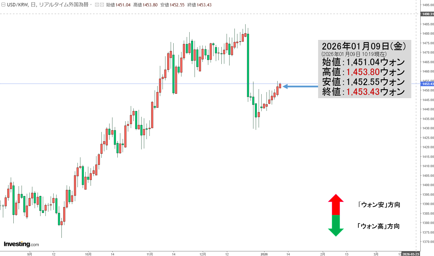2026年01月09日(金)15:30現在、ドルウォンのチャートは以下のようになっています(チャートは『Investing.com』より引用)。現在のところ「1ドル=1,457ウォン」近辺の攻防となっています。ローソク足1本が1分間の値動き...