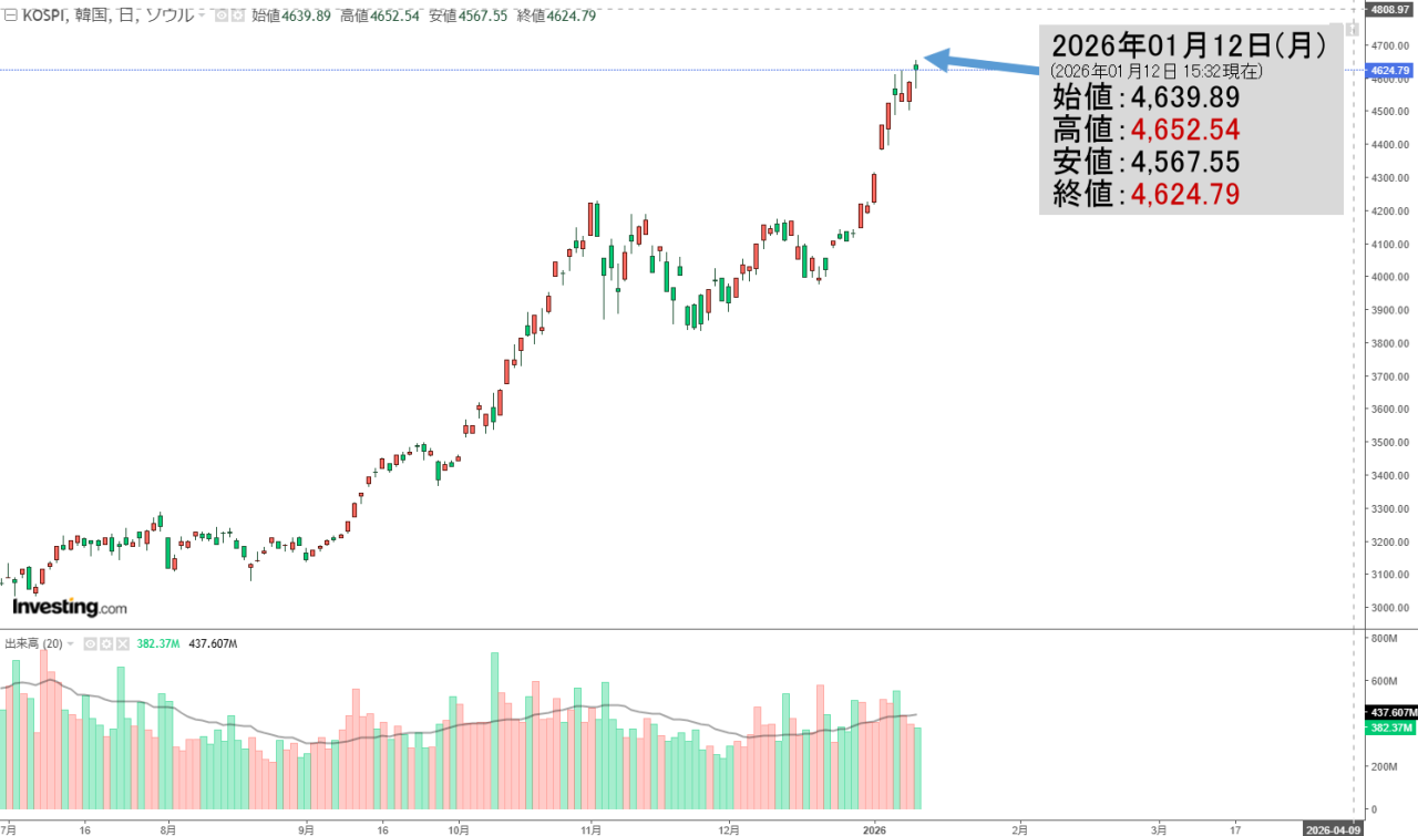 2026年01月12日(月)の韓国株式市場が締まりました。15:32現在、KOSPI(韓国総合株価指数)のチャートは以下のようになっています(チャートは『Investing.com』より引用)。