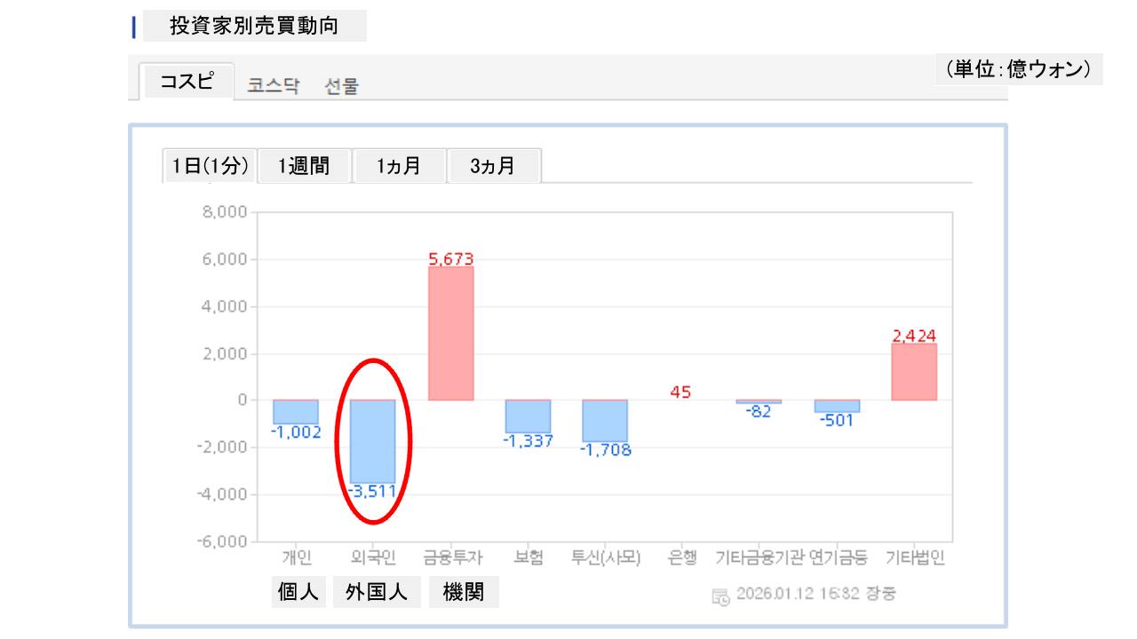 個人投資家は「1,002億ウォン」の売り越し。一方の外国人投資家は「3,511億ウォン」の売り越しです。